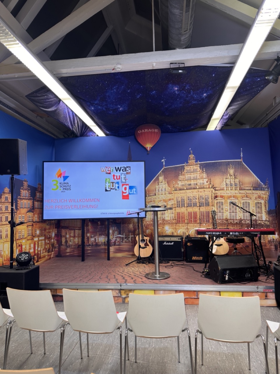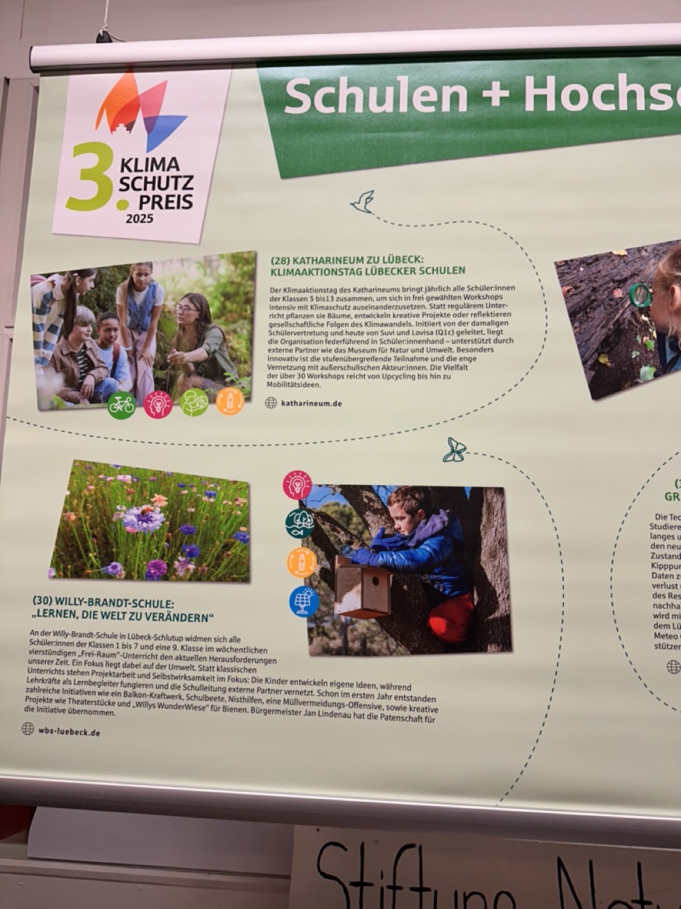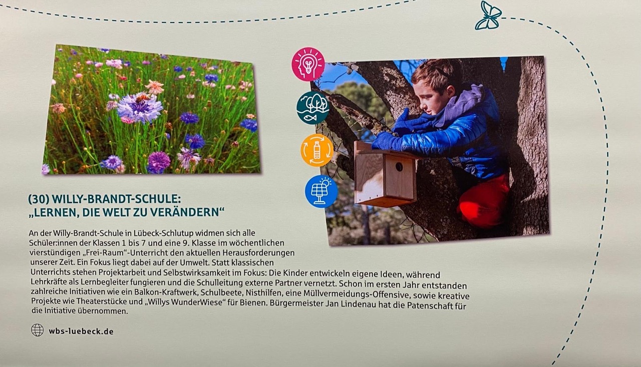 Wir haben uns mit dem „Frei-Raum“ für den Klimaschutzpreis der Gemeinnützigen Sparkassenstiftung beworben. Auch wenn sich natürlich nicht alle Projekte mit dem Klimaschutz beschäftigen. Aber unsere Idee von Partizipation und Einsatz für das Gemeinwohl hat uns zu der Bewerbung verleitet. Am 14.11.2025 waren wir daher in die Dräger-Garage zur Preisverleihung geladen. So ein schöner Ort, tolle Projekte und neue Kontakte. Emilia und Trisha haben uns begleitet. Sie haben sich für einePhotovoltaikanlage eingesetzt, einen Prototypen gebaut und setzen es nun in der Kirchstraße gemeinsam mit dem Nachhaltigkeitsbeauftragten der Hansestadt Lübeck – Florian Lotties- um.